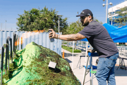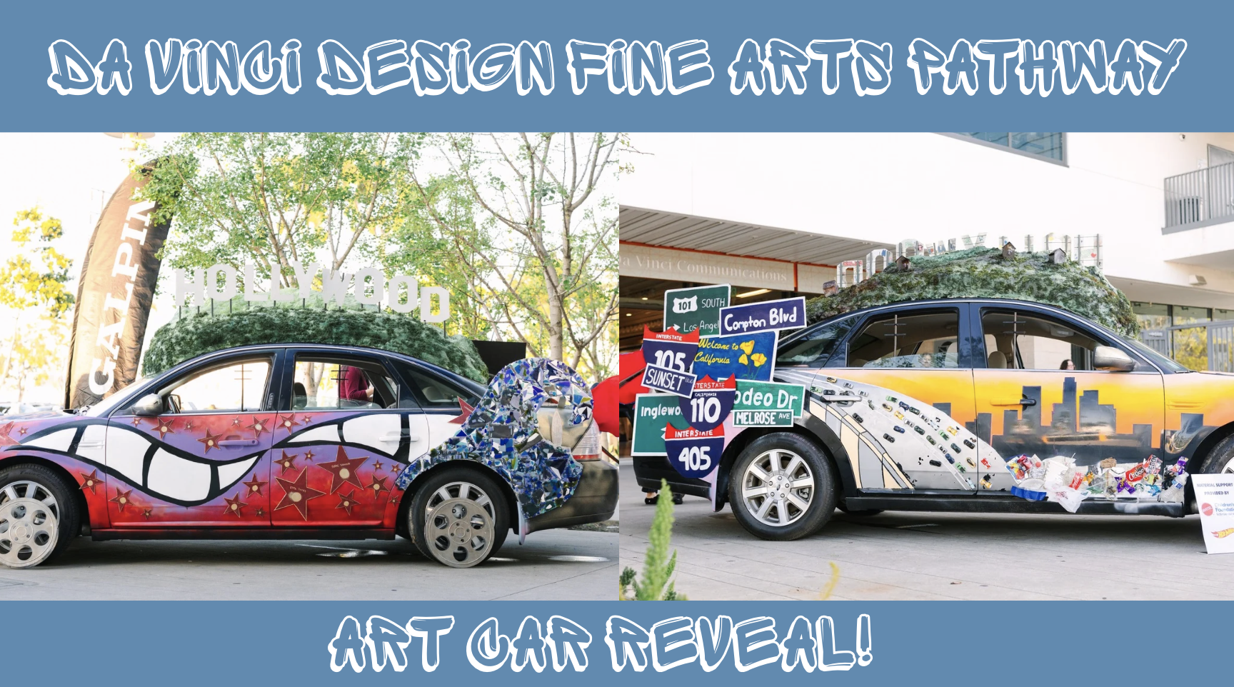 Together, the talented team transformed a 2009 Ford Taurus, donated by Galpin Ford, into a rolling work of art, using a wide range of mixed-media materials—expanding foam, artificial moss, balsa wood, glass mosaic tile, handmade freeway signs, decomposed granite, and more. The Hollywood Hills were shaped from foam and moss, with students adding graffiti to the back side, while balsa wood houses were set ablaze to create Palisades fire imagery.