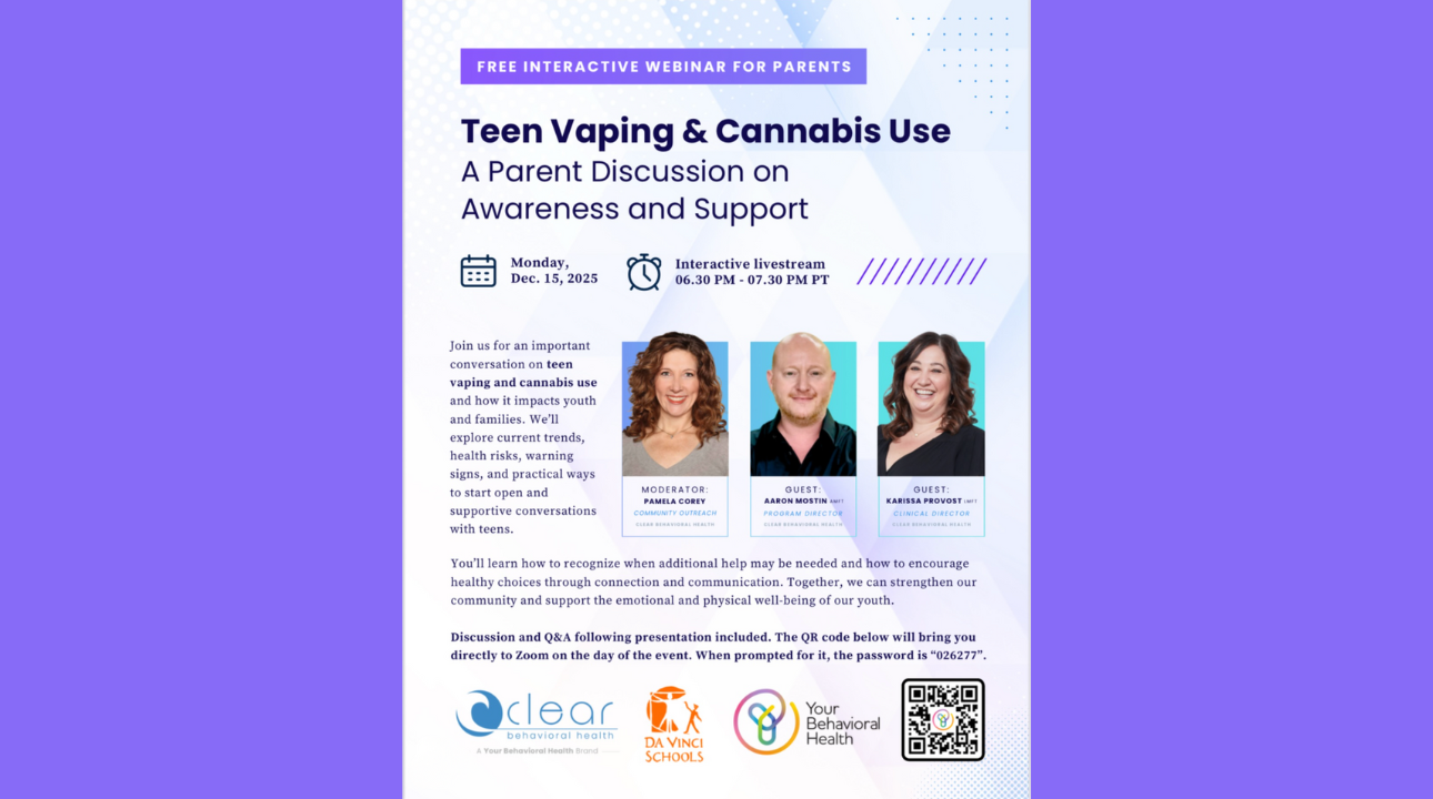 Da Vinci Schools recently hosted a powerful parent/caregiver webinar on teen vaping and cannabis use, featuring expert clinicians from Clear Behavioral Health. The conversation delivered critical, timely information for families—highlighting warning signs to watch for, addressing common misconceptions, and offering practical, compassionate strategies to help parents support their teens with confidence and care.